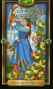 I drew the Nine of Pentacles. In case you asked, yes I shuffle the cards and they are not supposed to come out in order but, they have a mind of their own. The Nine of Pentacles symbolizes hard work coming to fruition. You see the lady on the card, just chillaxing with her pet bird and no big deal with a shit load of pentacles hanging on her tree. I take it; I need to be opened to work hard for the pentacles. Why do I hear that Donna Summer song in my head? “She works hard for the money, so hard for it honey”.